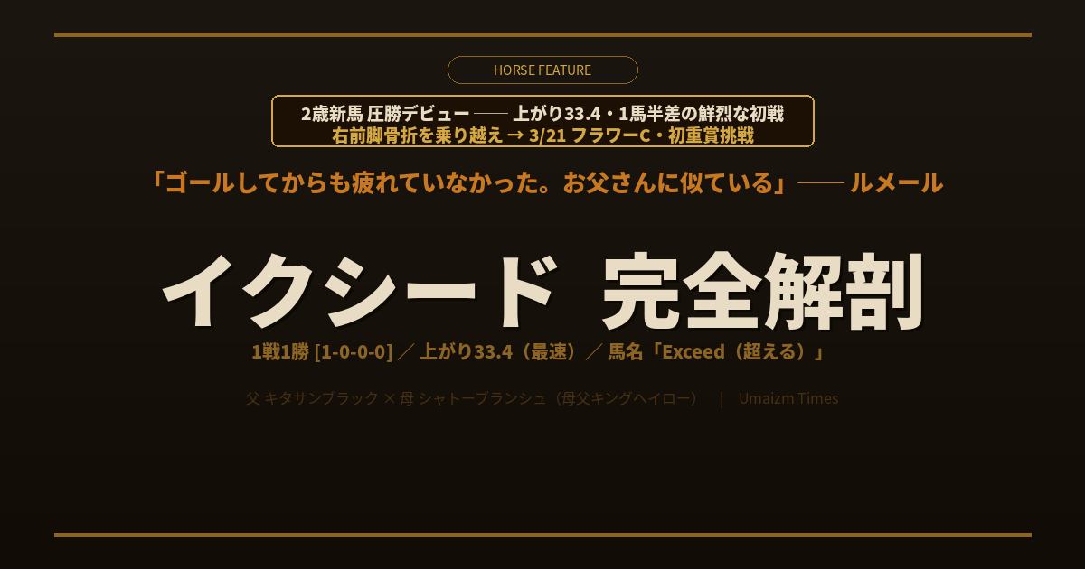 「イクシード(Exceed)」──「超える」という意味を持つその名は、全兄イクイノックスへの敬意と期待を一文字に凝縮している。G1・6勝、2023年世界ランキング1位という日本競馬史上最強ともいえる兄の背中を超えることを宿命として生まれたこの黒鹿毛牝馬は、デビュー戦で上がり33.4秒という豪脚を披露しながら、その直後に右前脚の橈側手根骨骨折という試練に見舞われた。5カ月の休養を経て、3月21日のフラワーC(中山・芝1800m・G3)で復帰する。同じ厩舎、同じ馬主、同じ騎手と、すべてが兄と同じ条件で──「超える」という名の旅が、今、始まる。