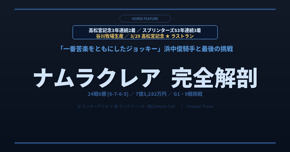 「ナムラクレア(Namura Clair)」──フランス語で「輝き」を意味するその名を持つこの青鹿毛牝馬は、スプリント界を7年間にわたって照らし続けた。谷川牧場(浦河町)生産・個人馬主という「非主流」の体制で、G1・9戦の壁を毎回わずかな差で越えられなかった。高松宮記念に3年連続2着、スプリンターズSに3年連続3着(2022年は2着)という「惜敗の記録」は、この馬の強さと、G1というものの残酷さを同時に示している。3月29日の高松宮記念が現役最後の舞台となる。最後の鞍上には、デビューから長年苦楽をともにした浜中俊騎手が復帰する。
